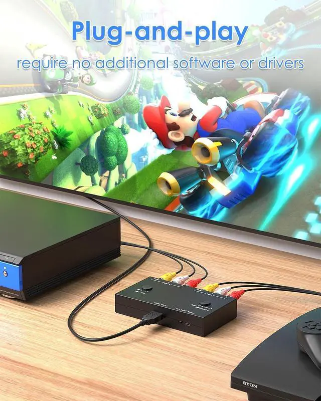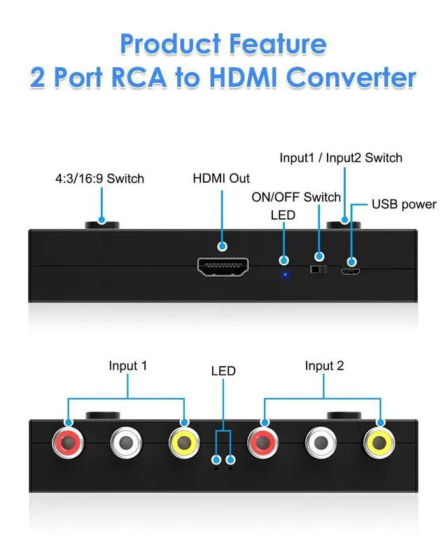 2 PORT RCA to HDMI CONVERTER with UPGRADE TECHNOLOGYConnect up to 2 composite RCA devices to a single HDMI port with this 2 port RCA to HDMI converter, supports 16:9/4:3 aspect ratios for seamless compatibility with your TV or display device. The analog to digital conversion in this module employs 10 bits maximal 162MSPS sampling, which automatically detects and converts the composite signal to 1080p output, bringing your media to life with sharp and realistic HD picture quality.