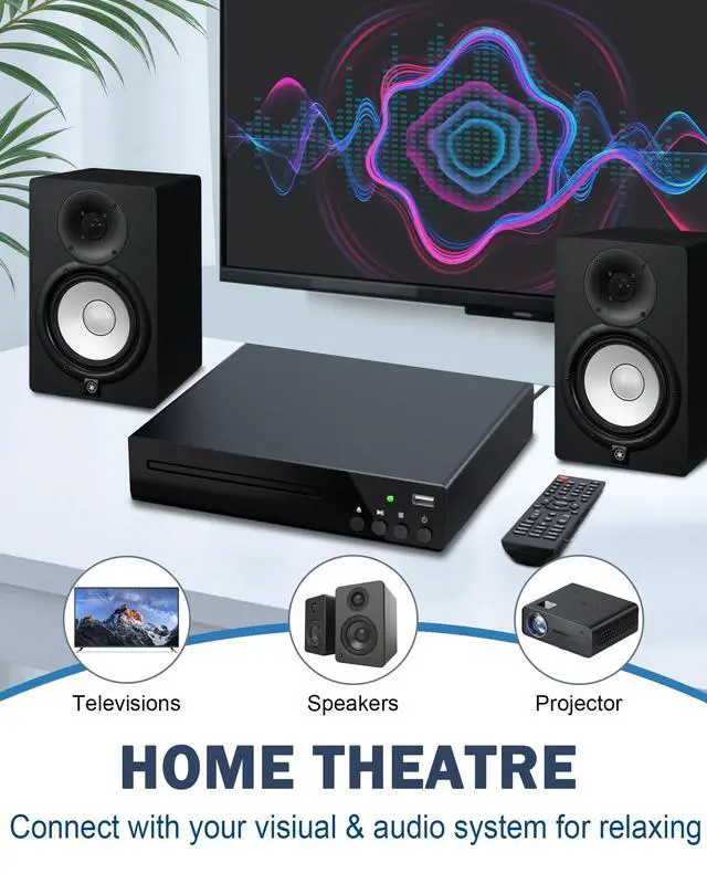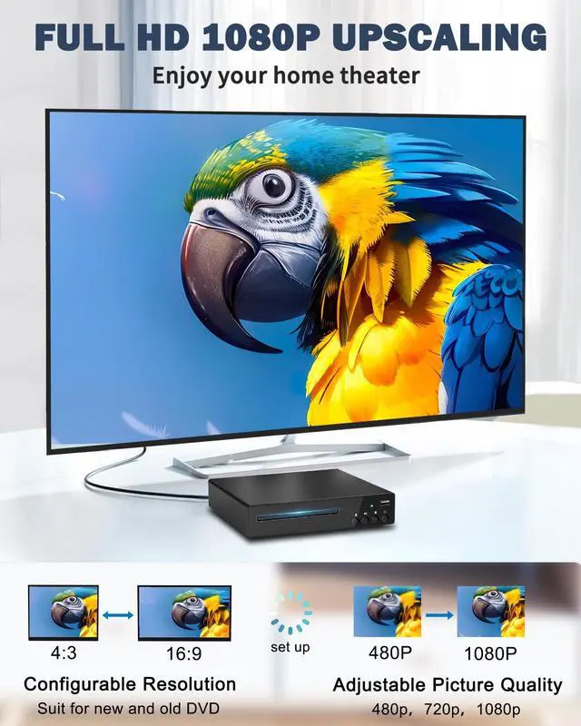 Durable and reliable design: This DVD player for TV features a sturdy metal casing that dissipates heat quickly and is highly shock-resistant, ensuring long-term stable performance. The multifunctional DVD player is equipped with a precision laser tray that can smoothly play discs from all regions. Its fast loading mechanism and sturdy structural design ensure reliable operation and connectivity. ^^ Universal Disc and