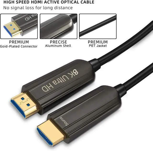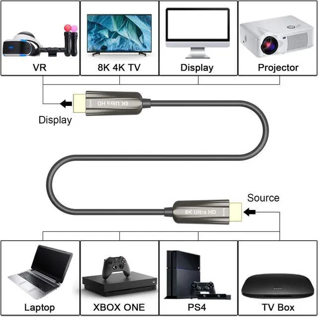 HDMI 2.1 CableThe 8K HDMI Fiber Optical cable supports with resolution and refresh rate up to 8K@60Hz, 4K@120Hz, Ultral high transmission speed up to 48Gbps bandwidth, and dynamic HDR and 12 Bit color processing technology, each scene of the video with higher brightness, higher contrast and wider color gamut ^^ Wide CompatibilityThe 8K Fiber optical HDMI Cable connects from HDMI devices to 8K HDTV, monitor, projector, enjoy ultra-high-definition image & video for gaming or entertainment, fit for game players. ^^ PLUG & PLAY DESIGN This hdmi 8K cable is plug and play removes the need for complicated drivers or setup time ^^ High PerformanceThis Ultra High Speed 48Gbps Friber optical HDMI 2.1 cable supports with Dynamic HDR, DTS-HD, HDCP 2.2 and 2.3, Dolby Vision, IMAX ENHANCED, Dolby Atmos, eARC, 3D video display etc.