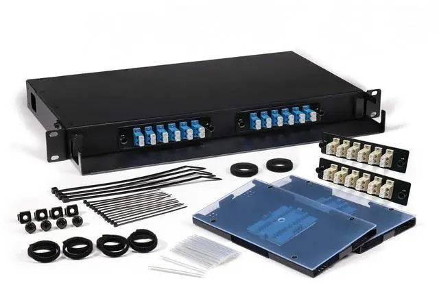 This Fiber patch panel is designed to offer an easy to use and easy to access solution for fiber patching and fiber optic splicing. This Rackmount fiber patch panel includes 2 - 12 Fiber LC Duplex Multimode adapter plates and 2 12 Fiber LC Duplex Singlemode adapter plates. It supports patching and splicing up to 24 Strands of Fiber. It includes multiple anchor points with velcro for securing internal cable routing. It features a slide out tray for easy access. The front of the patch panel features built-in connector protection keeping connectors safe from accidental bumps and swipes.
