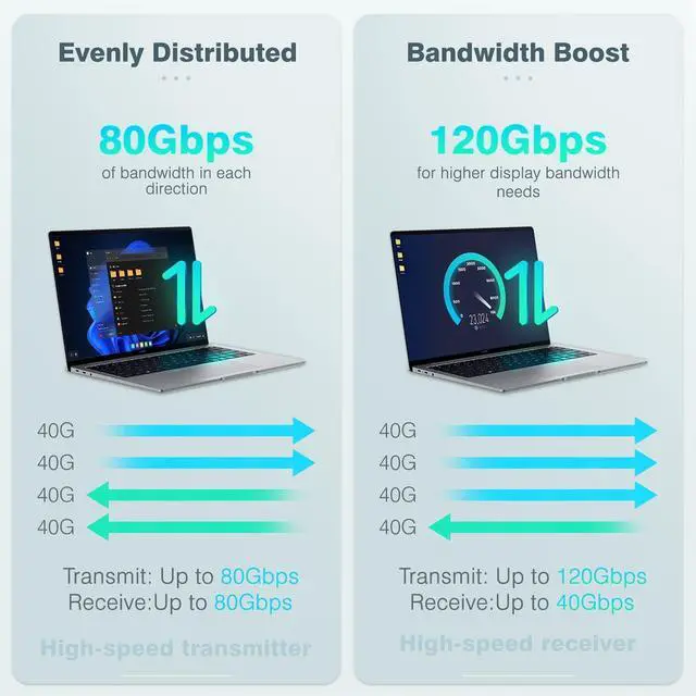 High Speed USB-C Data Cable: Built on USB-IF standards, USB4 V2 cable compatible with Thunderbolt 5 cable It will deliver 80 Gbps of bi-directional bandwidth, and with Bandwidth Boost it will provide up to 120 Gbps for the best display experience, providing outstanding display and data connections. USB C Thunderbolt 5 cable will meet the high bandwidth needs of content creators and gamers ^^ Dual 8K or 6K USB-C
