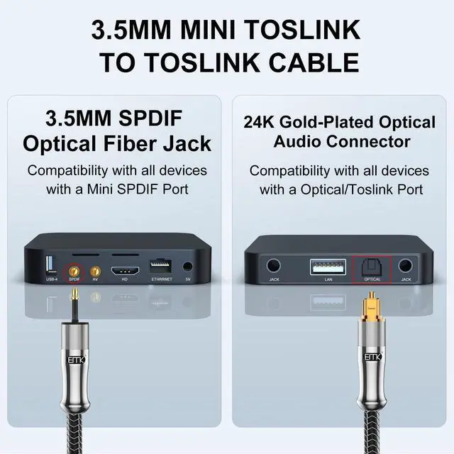 Note: Digital optical use only (not compatible with analog 3.5 mm aux). ^^ 24K Gold-Plated Mini TOSLINK Cable Engineered for superior audio fidelity, this premium optical cable features a 24K gold-plated 3.5 mm Mini TOSLINK connector and a precision-polished fiber core to ensure maximum signal clarity, minimal distortion, and ultra-accurate sound reproductiondelivering richer, more natural audio for an immersive listening experience. ^^ Unparalleled Sound Quality Experience studio-grade audio with this mini optical cable, delivering uncompressed PCM and LPCM signals while fully supporting immersive 5.1 to 7.1 surround sound formats including DTS-HD High Resolution for crystal-clear, theater-quality digital audio. ^^ Durable & Protective Design Built to last with a rugged nylon braided exterior that resists tangles and wear, plus removable rubber caps to safeguard the 24K gold-plated connectors from dust and damage when not in useensuring long-lasting performance and pristine signal quality.