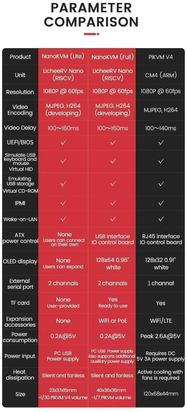 [Overview] Lichee Nanokvm is an IP-KVM product based on Licheererv Nano, which has taken over the size and powerful functions of Licheererv Nano. ^^ [Applicable crowd] Nanokvm Full is a complete version with exquisite housing, complete accessories, and a built-in system image card for booting. It is recommended for individual users. ^^ [Connectivity and Functionality] Nanokvm has an HDMI-compatible input interface, which can be recognized by the computer as a monitor and recorded on the computer screen. A USB 2.0 interface is connected to the computer host and can be identified as HID devices such as a keyboard, mouse, touchpad, etc.