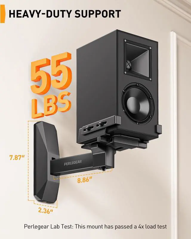 ^^ Secure Mounting System: Our speaker mount is built with a sturdy steel structure, supporting up to 55 lbs. The stable clamp design and grippy rubber padding prevent sliding and tipping. This bookshelf speaker wall mount has passed a 4x load test, ensuring long-lasting stability and reliability.