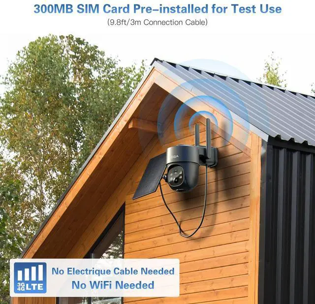 4G LTE CELLULAR SECURITY CAMERA SOLAR No WiFi/ electrical power needed. Can be worked anywhere nationwide with 4G LTE coverage. Suitable for outdoor places that is off-grid or no Wi-Fi, such as farms, construction sites, vacations homes, warehouse, etc. Comes with a prepaid EIOTCLUB SIM card with 300 MB internet data for initial test. Requires Monthly Data Plan for 4G SIM Card. No SIM Card Slot. Only Support the Built-in SIM Card and the SIM Card Cannot be Replaced. ^^ SOLAR & HIGH-CAPACITY BATTERY POWEREDWith a 5W High Efficiency Solar Panel and a built-in 9000mAh rechargeable battery, this No Wifi Security Camera can work independently regardless of a sudden poweroff.