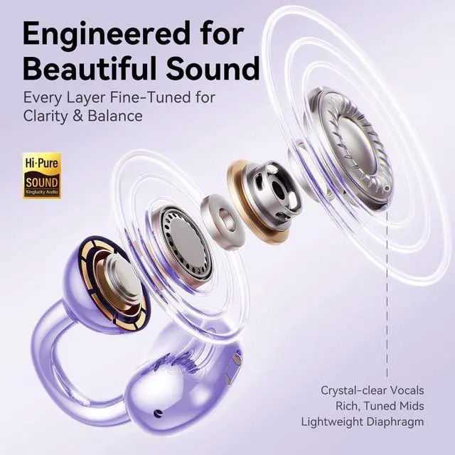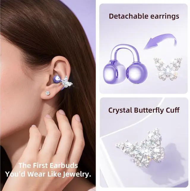 The First Clip-On Open Earbuds That Look Like Jewelry. Kinglucky introduces a new take on wireless audio clip-on open ear earbuds with detachable crystal earrings. Unlike other brands where earrings must be removed to charge, ours let you store and charge with earrings attached. They wear like accessories and sound like true wireless headphones. Whether you're heading out or on a call, these are a style upgrade youll actually use. ^^ All-Day Comfort for Small Ears Ear Clip Bluetooth Design. Unlike traditional earbuds, these ear clip Bluetooth headphones dont go inside your ear.