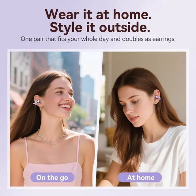 The open ear design sits lightly on the ear with no pressure. Just 4.0 g per side, theyre perfect for small ears, long hair, and even glasses no falling, no pinching, just comfort. And since the earrings never need to be removed for charging or storage, theres no extra hassle. ^^ Clear & Balanced Sound Tuned for Real Listening. Most open ear headphones focus on bass we tuned ours for what you actually listen to. Whether it's podcasts, phone calls, or playlists, enjoy clean vocals and soft depth without overwhelming your ears.