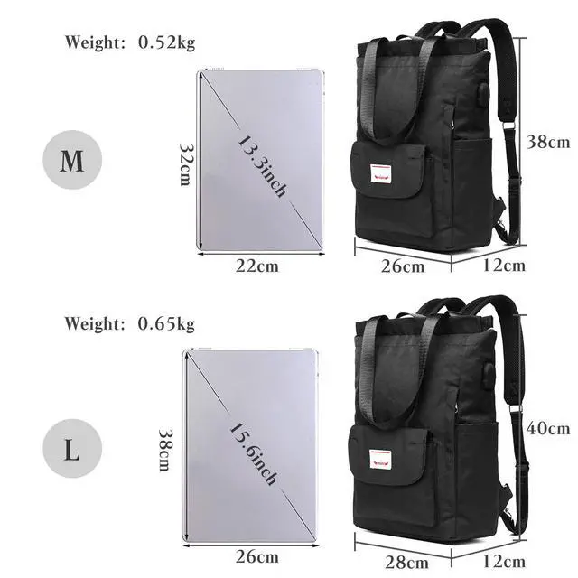 Weight: 0.52 kg. With 1main pocket, 1 shockproof laptop compartment (up to 14 inch), 1 inner zipper pocket and 2 inner patch pocket, 2 side pockets, 1 anti theft zipper side pocket, 1 pocket on luggage strap and 1 flexible and practical front pocket. Large, multi-pocket backpack ensures that your personal belongings are well-organized and easily accessible when needed.