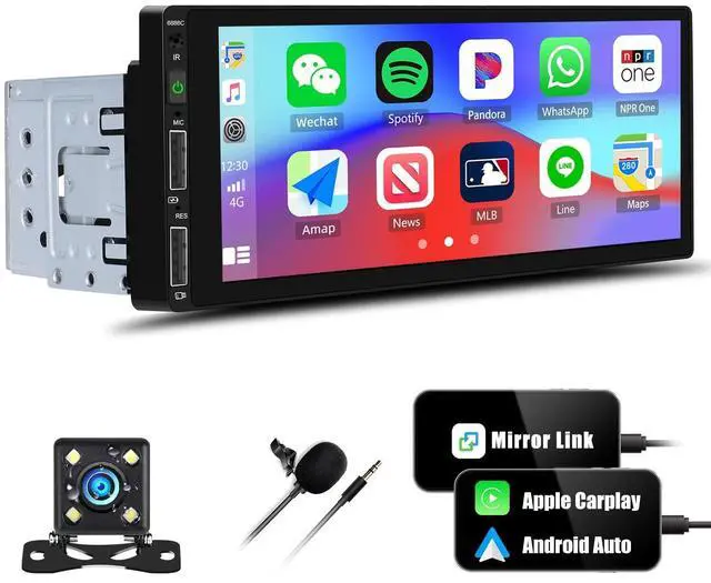 Compatible with A-pple CarPlay & Android AutoSingle din 6.9 inch touchscreen car radio audio receiver with Apple carplay siri voice control or Android Auto assistant, you can use many apps on this 1 din car media player, such as phone calling, GPS navigation, video, music, emails etc. Focusing on your driving with carplay or android auto voice control function ^^ Hands-Free Call 5.1 -Bluetooth + FM Radio + EQ Sound FeatureSingle din bluetooth car stereo support hands-free calling, wireless Bluetooth audio streaming, answering and making phone calls with no distraction, be safer and convenient! FM radio with 18 preset stations, you can adjust the radio frequency to get real-time information, such as news, music, sports and weather broadcast ^^ Mirror Link + HD Single Din Touch Screen Car RadioSupport screen mirroring on this touchscreen car stereo via original USB cable connection to your smart phone, then you can display the map or video playback on this touch screen media player.