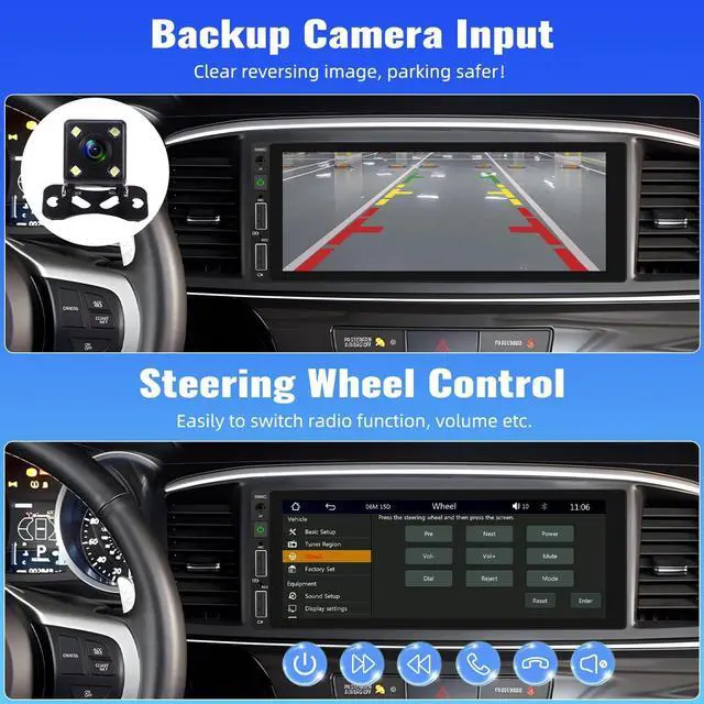 Auxiliary audio input supports external MP3, mobile phone, music player, etc. Our dual din car stereo support seven color backlight, you can choose color you want to decorate your car ^^ Power off Memory + SWCThe single din HD touchscreen car play radio receiver with bluetooth can automatically remember the playing state when power off, and when restarted, it will show the previous music or radio playing state. Steering wheel control helps you drive safely, allows you to deal with calls, and hands-free for safer driving