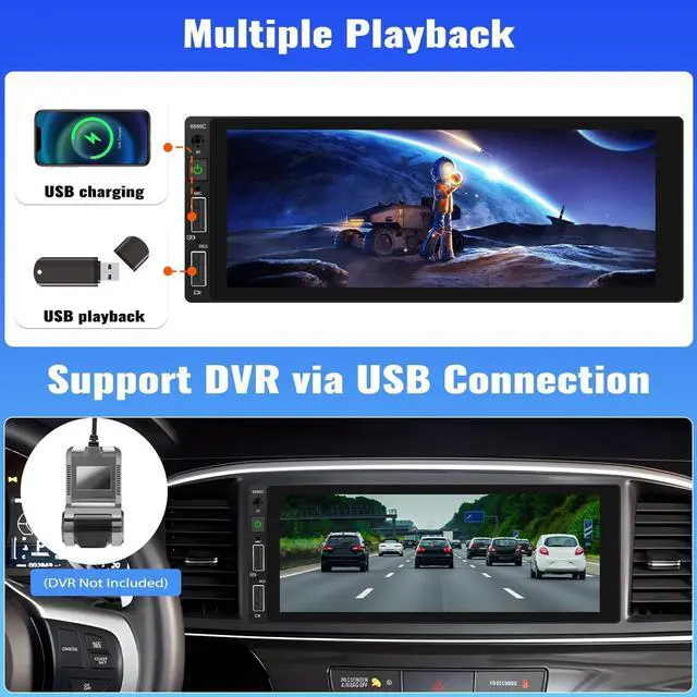 The 1 din car head unit with HD touch screen, 1248*480 resolution, clear colorful display ^^ Backup Camera Input + SWCAfter the 1 din bluetooth radio stereo connects to the camera, once you put into reverse gear, the mp5 car stereo will automatically display the reversing video. Through the steering wheel control buttons to operate car radio volume, change radio channels and switch songs etc ^^ Multi-function Dual USB & AUX in + Seven Color Backlight 6.86" wired single din carplay radio receivers features front two USB slots and AUX interface. This 6.86 inch MP5 car receiver supports USB to playback or charging phones.
