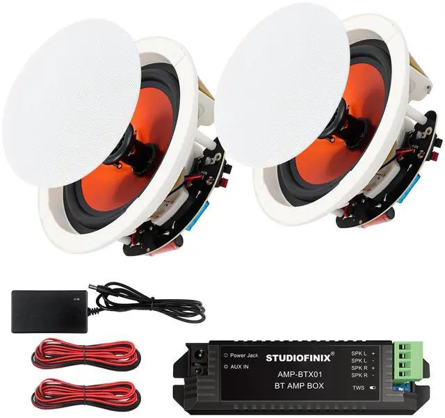 What's in the box: The total speaker diameter is 7.5 inches, with a cut-out diameter of 6.3 inches, speaker depth of 3.15 inches and a mounting depth of 3.15 inches. ceiling speakersX2, 2 channel amplifier X1, power adapter X1, 5 meters speaker wire X1