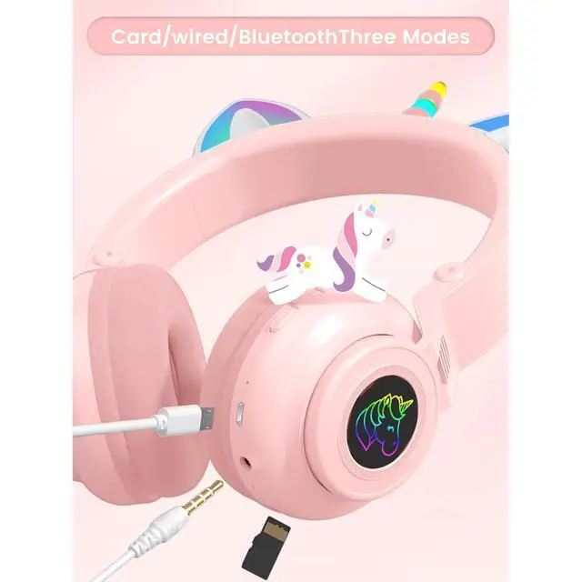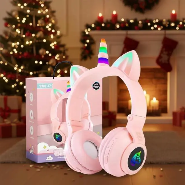 Magical Unicorn Cat-Ear Headphones with Glowing LED LightsMake every day feel magical! These adorable over-ear headphones feature a unicorn-inspired design with glowing cat ears that light up, creating an enchanting experience perfect for play, music, and imagination. An ideal gift for birthdays, holidays, or back-to-school surprises! ^^ Wireless & Wired Flexibility with Clear Stereo SoundEquipped with Bluetooth 5.0 for stable, wireless streaming, or use the audio cable for a reliable wired connection. Enjoy rich, high-quality stereo sound whether shes watching videos, gaming, or listening to her favorite songs on a phone, tablet, or PC.