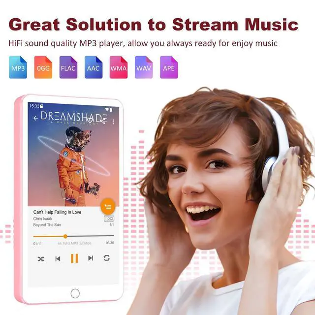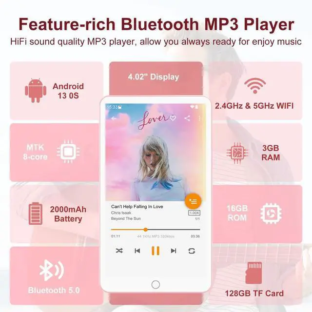 Fanvace 144GB MP3 Player with Bluetooth and WiFi, Android 13 MP3 MP4 Players with 4" Touchscreen and Speaker, MP3 Music Players with Spotify, Audible, Music, Play Store (Pink)