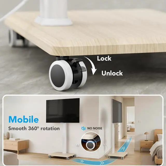 ^^ HEIGHT ADJUSTABLE AND SWIVELABLE The universal mobile TV stand has multiple height adjustments above and below in order to choose your optimal space, and the TV can be swiveled left and right (35) to provide you with the most comfortable viewing angle ^^ MOVABLE STAND This rolling TV stand rolls smoothly, and the 4 wheels allow the stand to be moved to the desired position at will. It is ideal for home offices, kitchens, yoga studios, living rooms, schools and trade shows with flexibility and convenience ^^ EASY INSTRUCTION AND CABLE MANAGEMENT Comes with relevant hardware accessories and a detailed installation manual, this floor stand can be installed in less than 15 minutes.