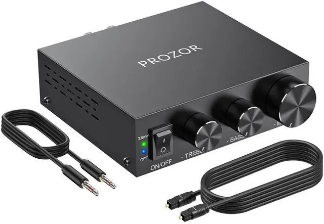 288W Peak Power, TPA3221 Class-D Amp Powered by TPA3221 Class-D amp, delivering up to 2 144W @4, 2 96W @6, 2 72W @8 with high efficiency, low distortion, and minimal heat. Includes a 24V/ 4.5A power supply for stable performance. (Not compatible with active speakers. ) ^^ Built-in 192KHz DAC, Plug-and-Play The 192KHz/24-bit DAC converts optical digital audio to high-fidelity L/R analog sound, enabling a direct connection from your TV's optical output to bookshelf speakers. Enjoy clear, immersive audio for home theater experience. ^^ 3.5 mm AUX Input for PC & Laptops Easily connect your desktop, laptop, or other devices with the 3.5 mm AUX input, making it more versatile for home and office setups.