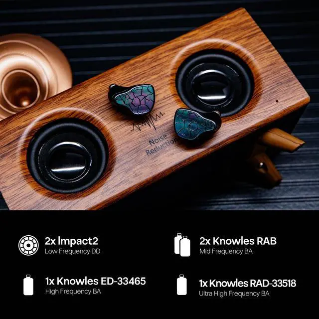 Imported Knowles BA Drivers: The MKII design was developed from the ground up. Two of the latest Knowles RAB series drivers focus on rich and pronounced low-mids, while separate ED-33465 driver layers up on mid-treble frequencies. This crossover strategy significantly enhances imaging capabilities as well as tonal depth in midrange. A single Knowles RAD-33518 ultra-tweeter has been strategically positioned within nozzle for an upper treble extension that rivals electrostatic and planar drivers ^^