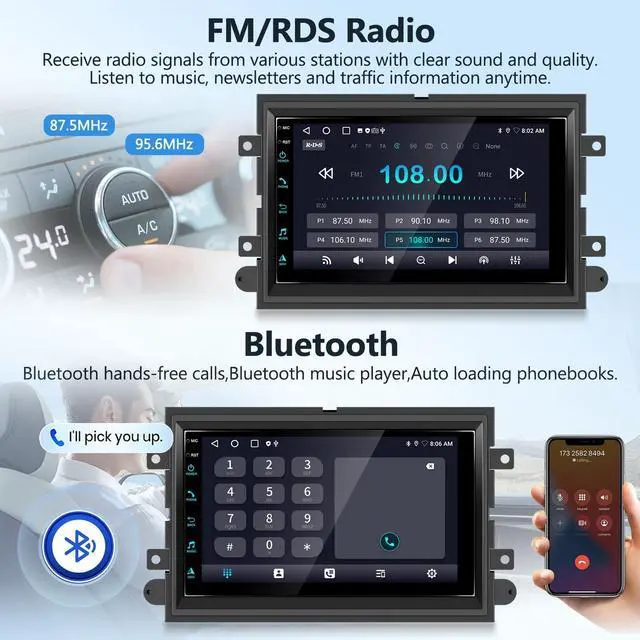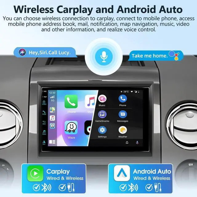 Compatible Models & Easy InstallThe easy-to-install car stereo system designed specifically for FORD F150. With a user-friendly interface and straightforward installation process, you can easily replace your existing stereo system with our compatible unit! This for FORD F150 car radio stereo offers a seamless upgrade to your vehicles audio experience, providing enhanced sound quality and a range of features to elevate your driving experience! ^^ Wireless CarplaySeamlessly connect your mobile phone to access a wide range of features including the address book, mail, notifications, map navigation, music, videos, and more.