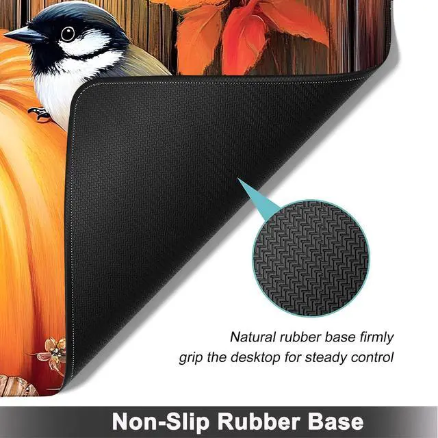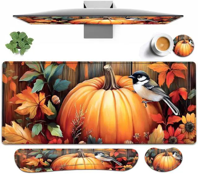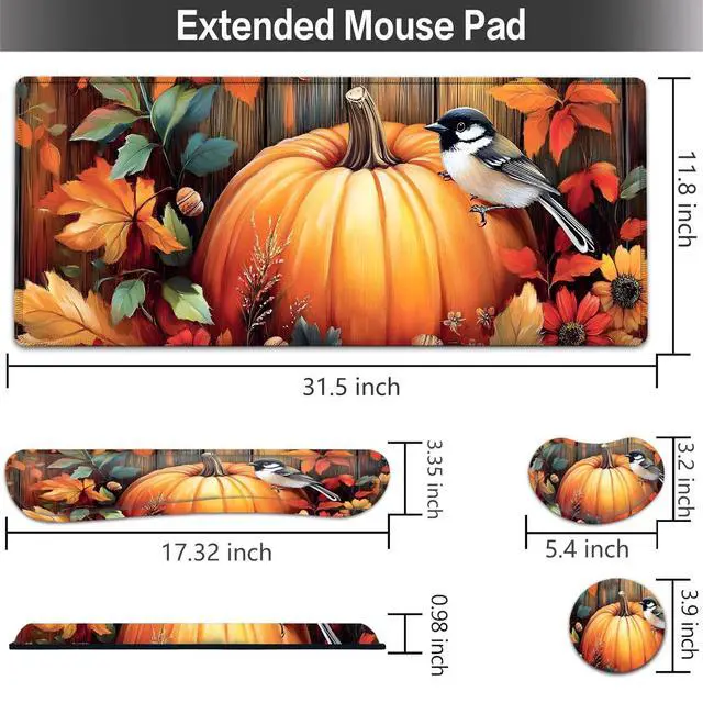Large Mouse pad and Keyboard Support Set, Ergonomic Memory Foam Keyboard Wrist Rest, Extended Gaming Mouse Pad with Stitched Edges, Fall Pumpkins and Bird XXL Desk Mat (31.5 X 11.8 in)