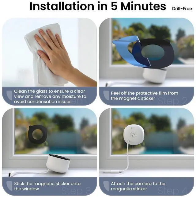 Wide-Angle Coverage: INFIYA 2K window camera presents sharp image quality through windows without glare and reflection, capturing every detail even from a distance. Install the dome cameras for home security on any interior window with the magnetic sticker for a drill-free setup. The 105 wide-angle lens captures more of your yard, porch, or driveway, while the optimized glass-penetrating tech ensures clear footage with fewer blind spots ^^