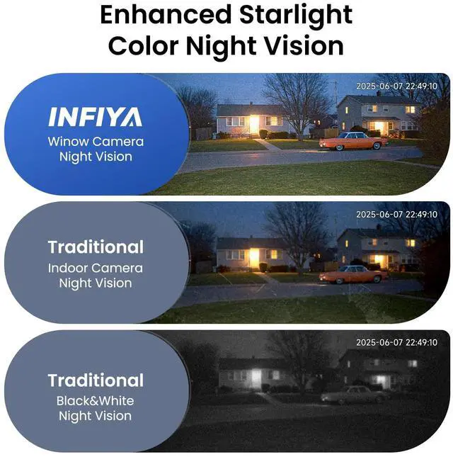 Full-Color Night Vision: INFIYA window cameras for home security feature vivid color footage even in low-light conditions (such as starlight/moonlight) with our advanced Black Light Color Technology. These security cameras wireless outdoor are perfect for identifying intruders' clothing, vehicle colors, or license plates through your window at night, without the harsh glare of infrared lights and without being noticed, providing discreet and effective theft-proof surveillance ^^ Effortless Setup and