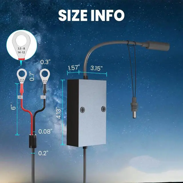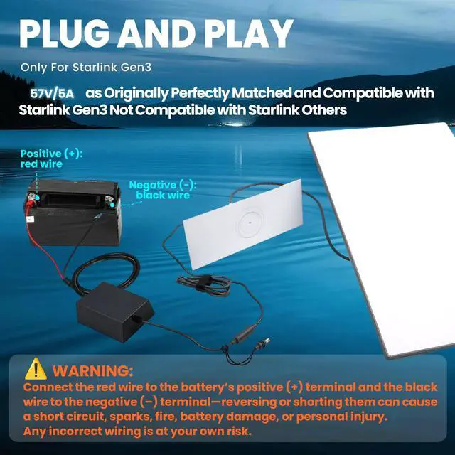 Designed for Starlink Gen 3 ^^ Plug & Play up to 200FT As a direct replacement for the original Starlink Standard Gen 3 power supply, this battery converter adapterter features a modular design and includes a 6.56FT detachable DC extension cable (replaceable with DC-DC extension cables up to 200FT). ^^ High-Load Foolproof Cables ^^ 5A Safety Rating 5A-rated red/black cables feature thickened copper cores (reducing resistance for stable transmission) with high-temperature resistant coating, engineered for long-term use with Starlink GEN 3 battery systems. Clearly marked dual terminals prevent miswiring, ensuring secure battery connections and adapter protectionan essential component for reliable Starlink accessories.