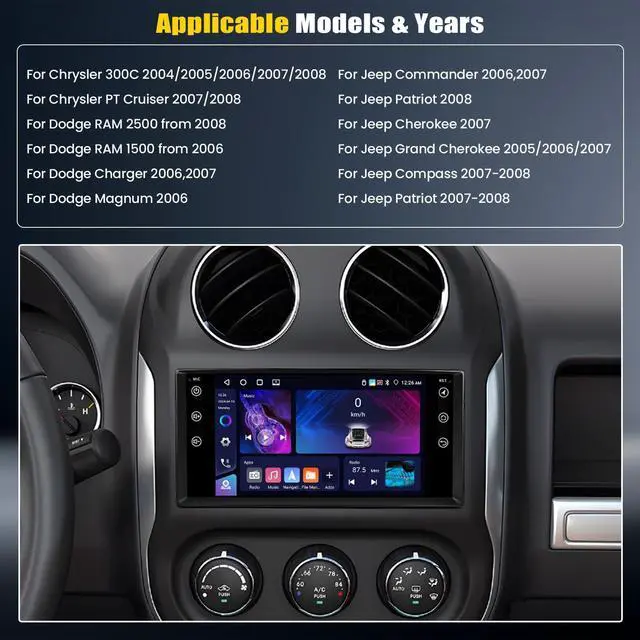 Applicable Car ModelsFor Jeep Wrangler/Unlimited 2007-2018; For Jeep Compass 2009-2016; For Jeep Patriot 2009-2016; For Jeep Grand Cherokee 2005-2011; For Jeep Liberty 2008-2011; For Jeep Commander 2008-2011; For Chrysler Sebring 2007-2010; For Town&Country 2007-2010; For Dodge Grand Caravan 2011-2014; For Dodge Charger 2008-2010; For Dodge Ram Pickup 1500/2500/3500 2009-2012. ^^ Built-in Wireless Carplay & Android Auto& Mirror linkBulit in Wireless Carplay & Wired Android Auto, support to use smart voice assistant or touch the display, you can make calls, send and receive messages, and enjoy music etc.