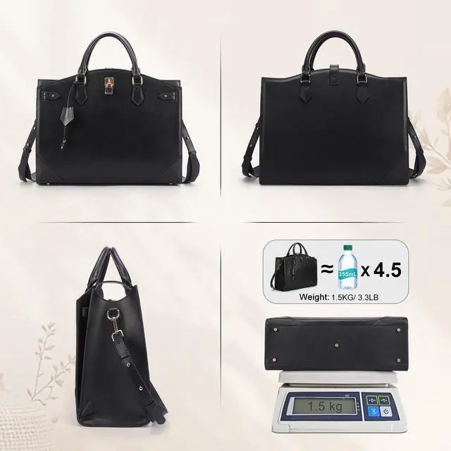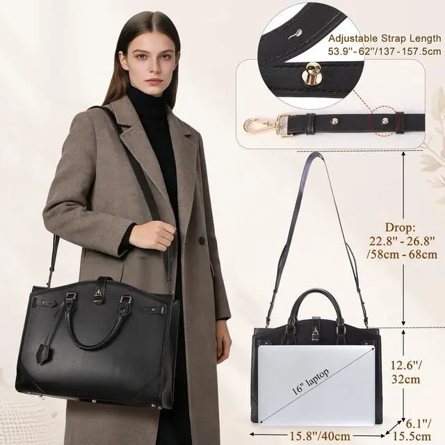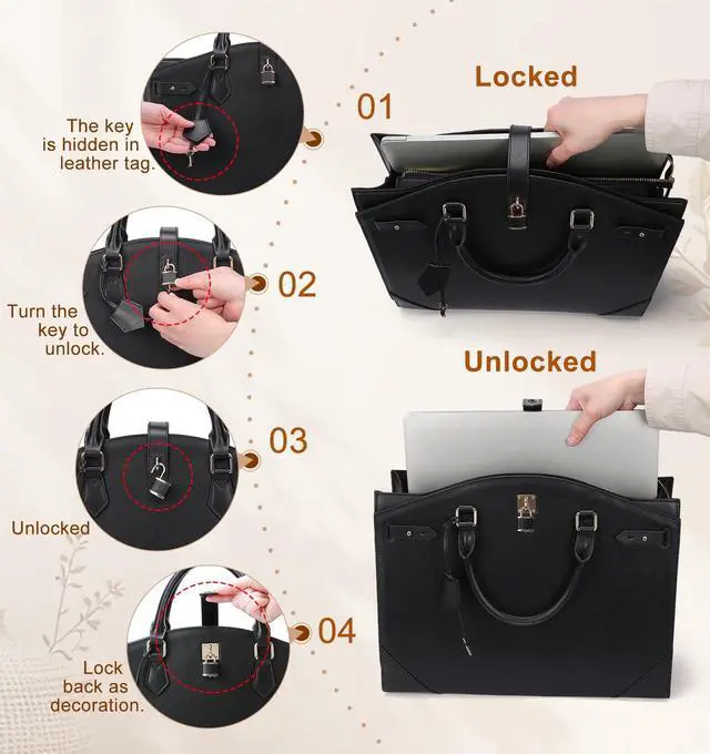 Leather Work Tote BagThe black laptop briefcase for women is hard side finish, thus the leather handbag can hold its shape when empty. It helps to create professional image in the workplace. Perfect for work, business trip, meeting, interviews, daily commuting, teaching, shopping, or casual use. Its good gift to office ladies, college graduates, teachers, fashion enthusiasts for Valentine's Day, Mothers Day, anniversaries, birthday, Christmas, and New Year. ^^ Anti-theft & Expandable Laptop Bag The leather tote bag for women is unique & stylish with original design by our designer.