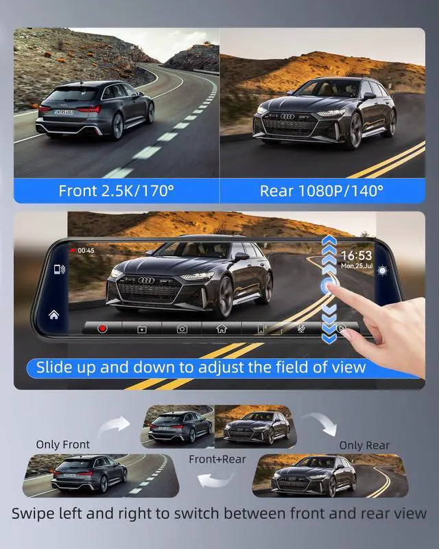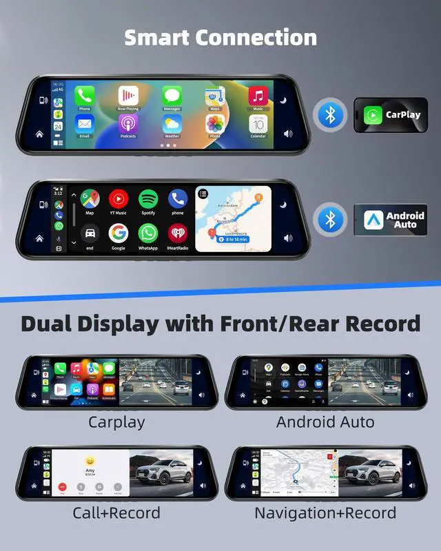 Driving ProtectionThis rear view mirror camera equipped with front QHD 2.5K & rear FHD 1080P, sharply capture your driving details, such as car plate, road sign. WDR was featured for you to see clearly in overexposed or dark environments. With front 170and rear 140, providing trusted evidence for any situation. ^^ Effortless In-car CarPlay ExperienceSeamlessly connect this mirror dash cam with CarPlay and Android Auto via bluetooth, enrich your driving time - navigation to places, make phone calls without distraction, enjoy your favorite songs, greet a more fantastic driving way.