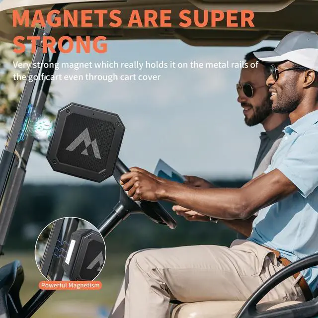Magnetic Speaker]: This portable speaker comes complete with a built-in super strong magnet and a detachable lanyard, making it easy to carry and magnetically attach to golf carts, bikes, scooters, basketball posts, or clip to golf bags, backpacks, strollers, and more. It's the perfect choice for golf cart, ensuring you can enjoy your music wherever you go. ^^ [Powerful and Punchy with