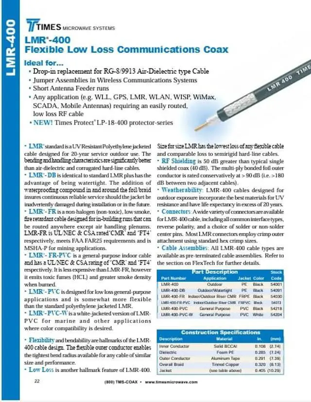Cable Material: Flexible Indoor/Outdoor UV Proof PE, Outer Diameter: .405 (10.287mm), Aluminum Tape Outer Conductor, Foam PE Dielectric, and SCCA Inner Conductor. Perfect replacement for RG-8