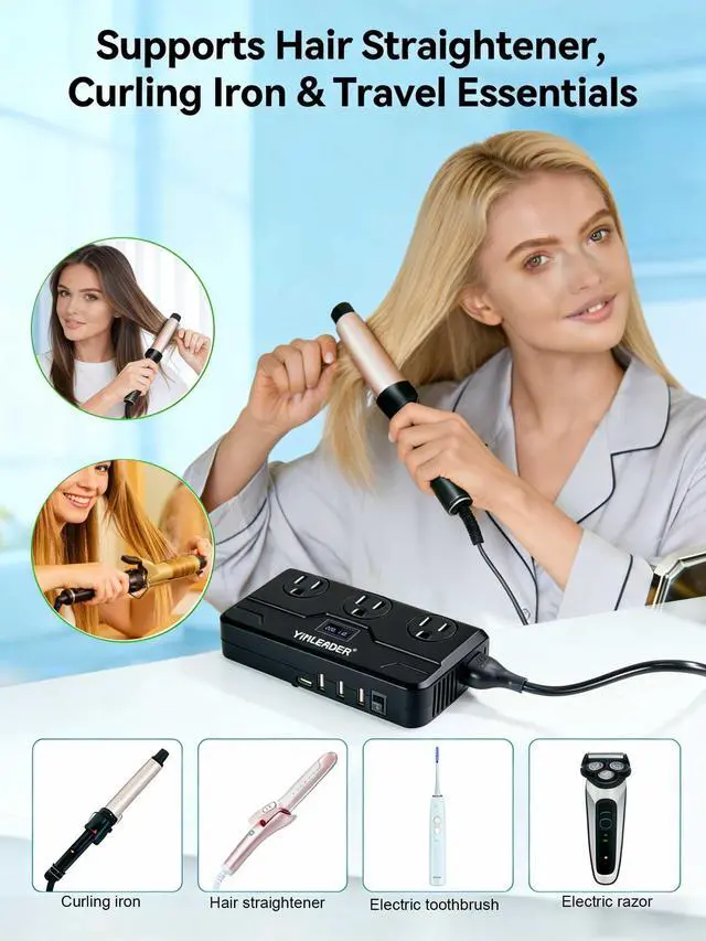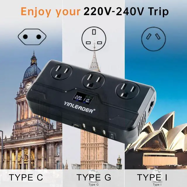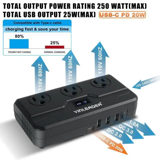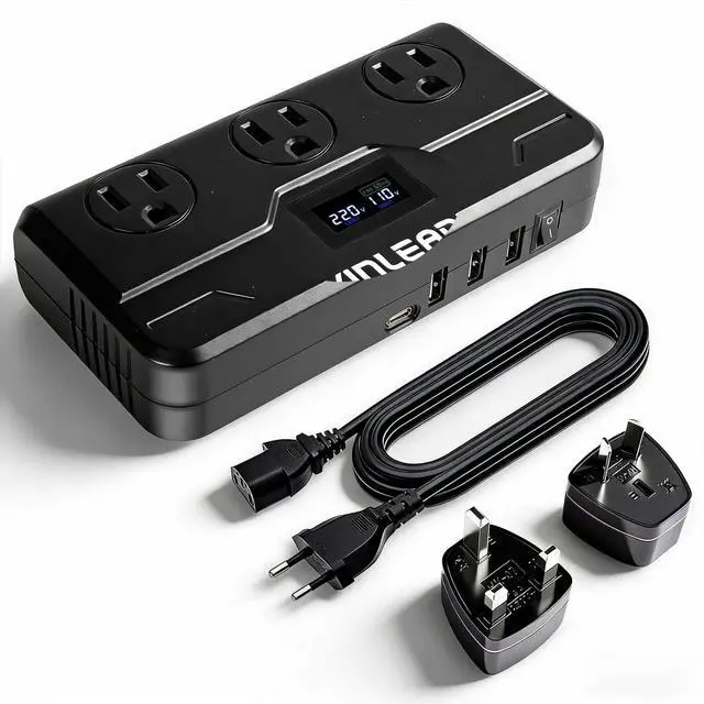 Please note: not suitable for high - power devices like hair dryers, coffee makers, and electric kettles. ^^ 7-in-1 European Power ConverterThis power converter adapter set comes with 3 AC sockets, 3 USB - A ports, and 1 USB - C port, allowing you to charge 7 devices simultaneously. Whether it's your Bluetooth headset, mobile phone, or tablet, everything can be powered up at once. Measuring 6.3 x 3.2 x 1.4 inches, its portable design makes it perfect for both short - and long - distance trips. ^^ LCD Display for Precise MonitoringKeep track of the input voltage, output voltage, and output frequency with the clear LCD display. The converter features a soft - start function, with the display lighting up 5 seconds after startup and turning off 5 seconds after shutdown. Rest assured, you can always know the converter's status at a glance. ^^ Comprehensive Safety ProtectionEquipped with 5 - second soft - start, over - current, over - temperature, short - circuit, and overload protection, this converter ensures the safety of your devices. In case of 0V output, indicating the activation of the protection mode, simply turn off and restart the converter.