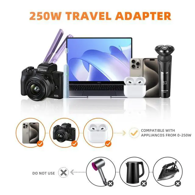 220V-240V 50HZ to 110V 60HZ Voltage ConverterOur 220V - 240V 50Hz to 110V 60Hz voltage converter is tailor - made for world travelers. Compatible with over 150 countries, it enables you to use your US - based electronics effortlessly in places like the UK, continental Europe, Australia, China, and more. Say goodbye to voltage compatibility issues during your global adventures. ^^ Enhanced 250W Power Capacity This advanced step - down converter is engineered to support devices ranging from 0 to 250 watts. Ideal for most low - to - medium - power appliances such as hair straighteners, curling irons, breast pumps, CPAP machines, nebulizers, electric toothbrushes, and electric shavers.