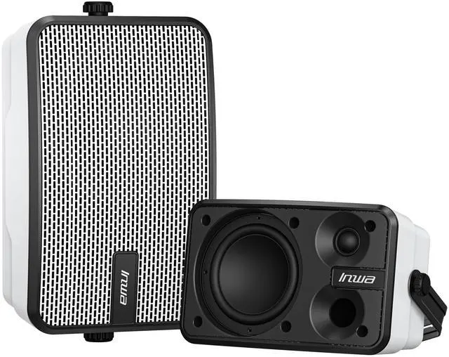 ^^: This outdoor speaker system is powered by corded adapter which providing stable and strong power output. Each speaker has built-in high-quality 1-inch tweeters and 4-inch woofer for surround sound reproduction and impressive bass response. Up to 400-watt peak power / 40W RMS power per speaker. (Corded power adapters are included) ^^: With 9.4 inch in length, and 5.3 inch in height, this wireless speaker system comes with a remote control for easy operation and is suitable for many space, wherever on the underside of porch roof, under the patio cover, outdoor bar, gazebo, garage, small shop, etc. Arrived with all mounting accessories, very easy to install.