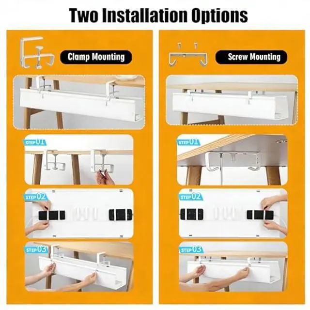 Two Installation Methods: Enjoy quick and easy setup with either clamp-on or screw-mounted installationno drilling required. Built with a sturdy structure and 12 secure straps, this desk cable management system provides a durable and reliable cord organization solution ^^