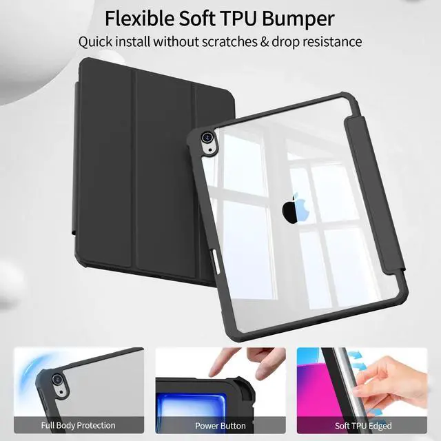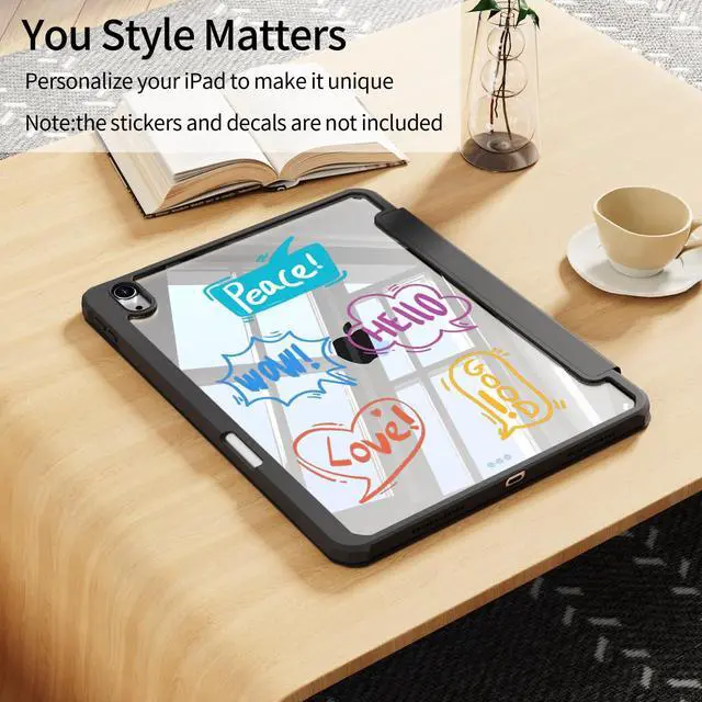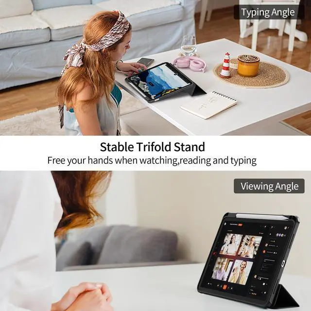 Note: It will not be compatible other model. Please check your iPad model before purchase ^^ Full Protection The HD Clear hardshell back cover with flexible TPU bumper provides excellent protection for your iPad against scratches and impacts while offering a comfortable grip and premium look, showcasing the original beauty of your devicePlease tear off the film inside and outside the back shell ^^ Precise Cutouts & Auto Wake/Sleep The iPad case features precise cutouts, ensuring easy access to all ports, sensors, speakers, and cameras. Equipped with a magnetic strip in the front cover, it supports the auto sleep/wake function, smartly putting your tablet to sleep or waking it when closed or opened, extending battery life and protecting your iPad ^^ Built-in Pencil Holder Built-in pencil holder on the right side of the case, convenient for charging and storing pencils. When not in use, you can put the pencil in the position of the pencil holder to charge, to avoid losing or breaking the pencil when walking or outdoors. (Pencil not included. ) ^^ 2 Viewing Angles Design of the trifold stand can easily change the angle to meet your viewing and typing needs.