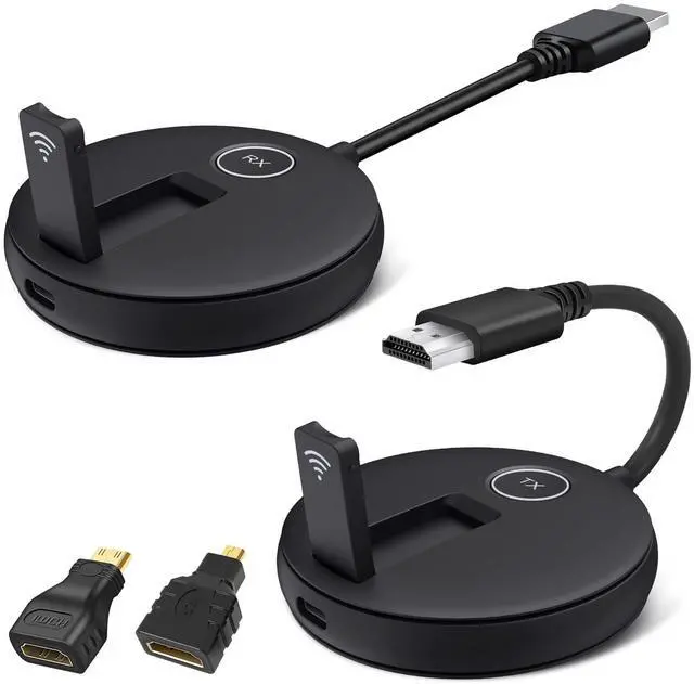 NOTE: When using this app, your phone or tablet cannot control the interface or perform remote recording. It can only be used as a portable second screen for viewing. ^^ Wath's in the box? 1 Wireless HDMI Transmitter and 1 Wireless HDMI Receivers 1 Mini HDMI Adapter and 1 Micro HDMI Adapter 2x USB-A port 5V/1A chargers 1x HDMI extension cable 2x Type-C Charging Cables