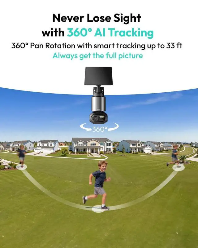 3. The quick search function helps you find people, vehicles, or objects in historical footage in 1 second. ^^ No Subscription Security Camera with Base StationNo monthly fee for the outdoor camera, The H200 base station features 32GB of local storage, automatically cycling and preserving up to two months of footage. Storage capacity can be expanded up to 16TB via hard drive. Optional subscription plans unlock advanced features and extend cloud storage space (includes 48 hours of free cloud storage). 2.4G WiFi ensures lag-free viewing over long distances. ^^ 360 Surveillance Camera with AI Precise TrackingThe wireless security camera's 360 ultra-wide viewing angle ensures comprehensive coverage, completely eliminating monitoring blind spots.