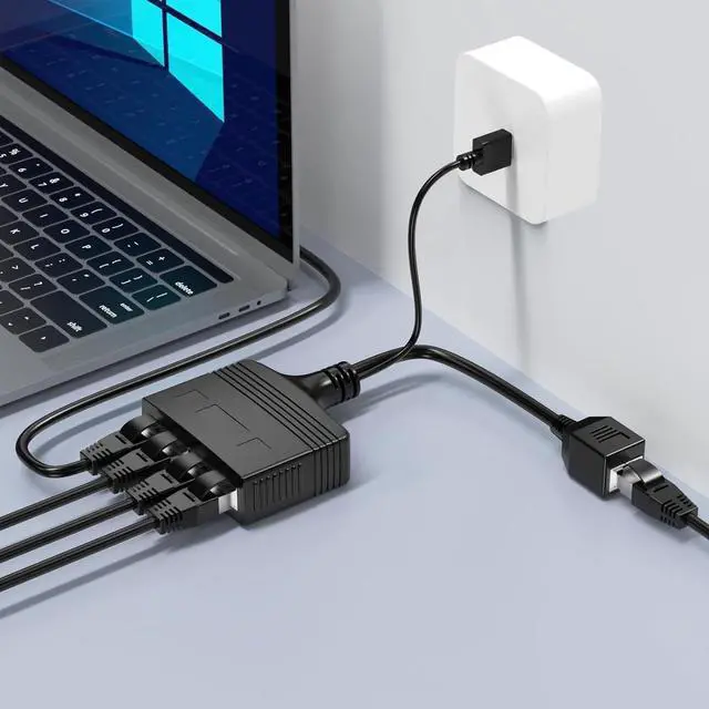 Gigabit RJ45 Ethernet Splitter 1 to 4This Gigabit RJ45 Ethernet Splitter, Ethernet Splitter 1 to 4 with a USB charging cable [4 Devices Simultaneous Networking], the maximum speed of each device is 1000mbps. RJ45 Network Splitter is mainly used to solve the connection problem caused by insufficient wiring, use the USB power supply cable and support four computers to share one ethernet cable simultaneously by means of the physical tapping method. Wide CompatibilityRJ45 8P8C Ethernet Splitter connector is compatible with Cat8 Cat 7 Cat6 Cat5 Cat5e Network Ethernet Cable and can compatible with ADSL, hubs, switch, TV, set-top box, router, wireless device, computer, etc.