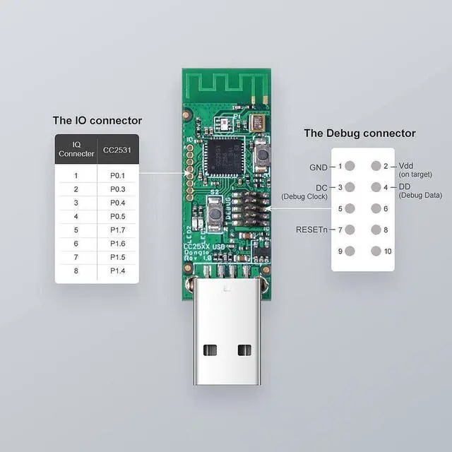 Features: * The CC2531 USB dongle is a fully operational USB device which provides a PC interface to IEEE 802.15. 4 / ZB applications. * Comes with a CC2531ZNP-Prod firmware, it is a ready-to-go CC2531 USB dongle for ZB 2mqtt application. * The dongle can be plugged directly into your PC/Raspberry etc used as a ZB packet sniffer. * Two buttons and two LEDs for user interaction. * Lead out 8 IO connectors. Debug interface. USB dongle size is 5.6 * 1.6 * 0.7 cm.