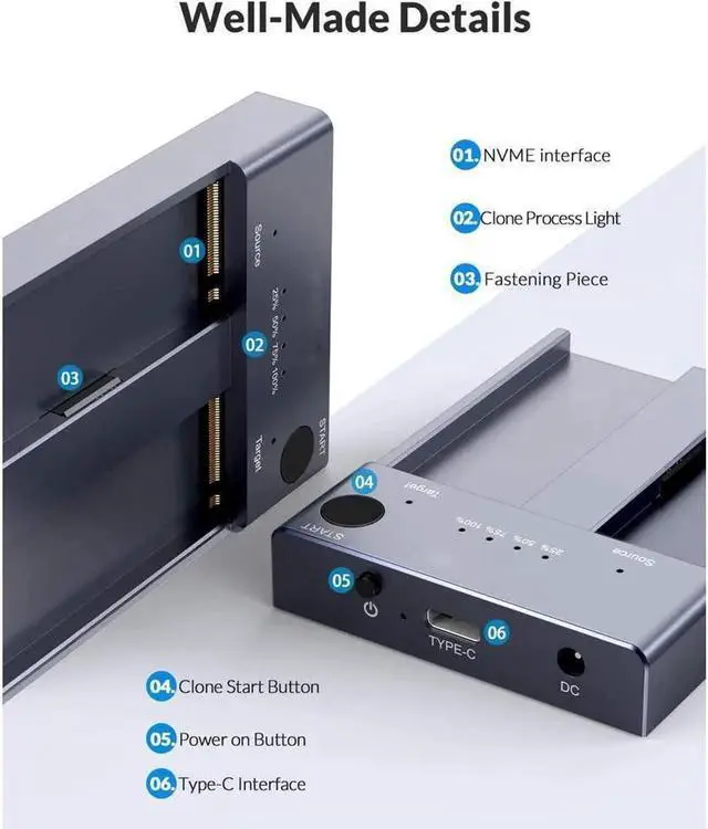 Wide Compatibility: this hard drive duplicator supports Windows/Mac OS/Linux, offered with USB A to C cable and USB C to C cable, can work with smartphone/computer/TV/PS4 etc.
