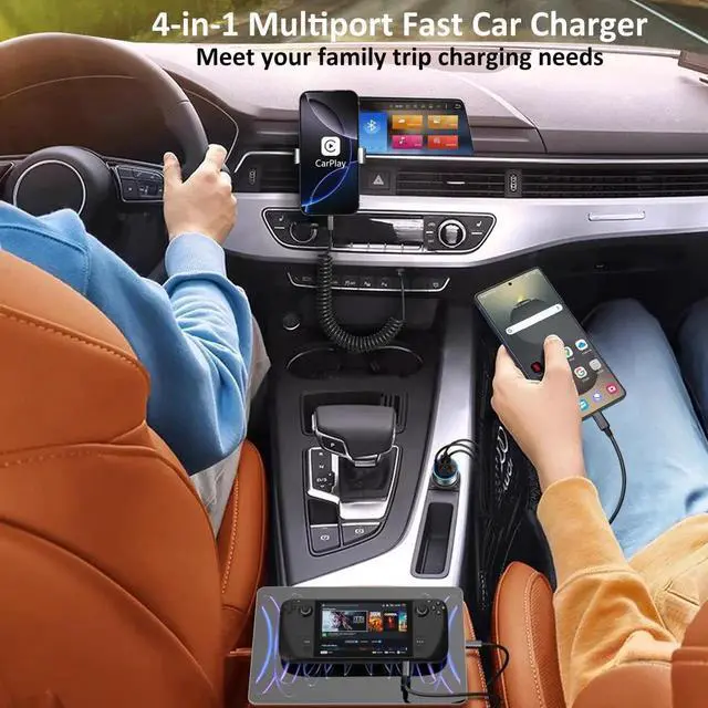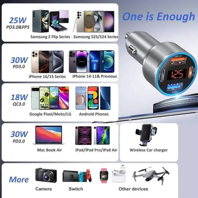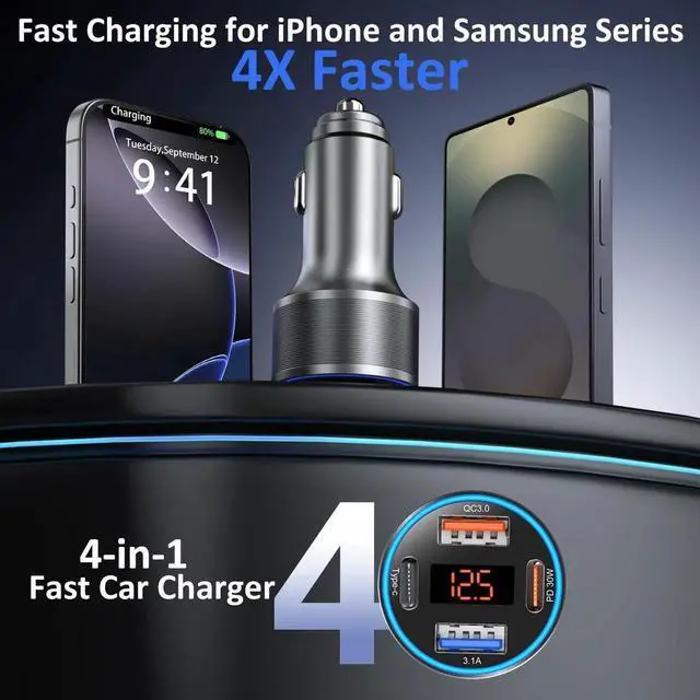 • 4-in-1 Fast Car Charger: Car usb adapter designed with dual usb-c and usb-a multi car charging port, enable you to charge multiple devices at the same time. Equipped with QC and PD 3.0 fast charging technology, the upgraded car phone charger can support max 30w power delivery for the latest usb-c devices,like iPhone 16e/16 Pro Max and 18w quick 3.0 fast charging for most Android phones.