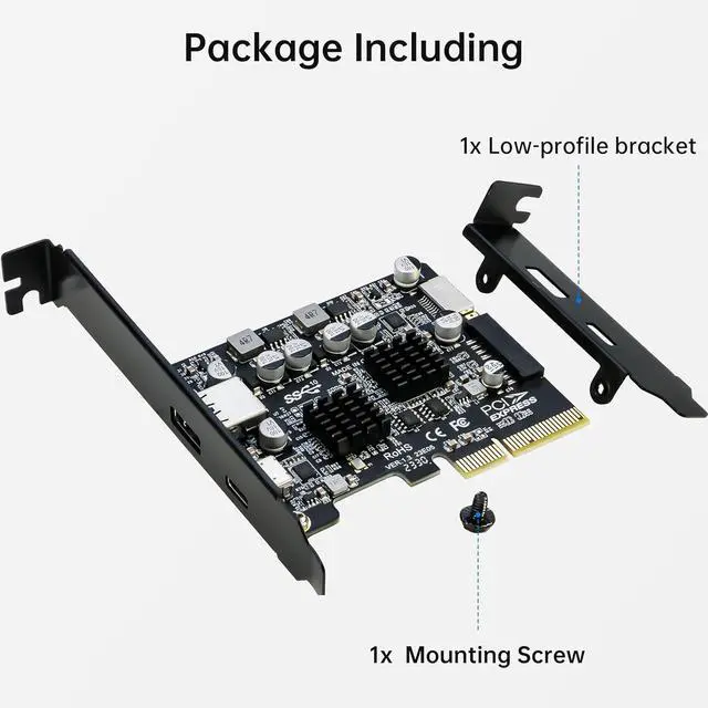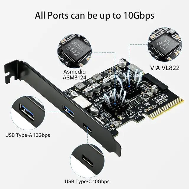 This PCIE USB3.2 expansion card adopts ASM3142+822 main control chip, support PCIE 3.0 maximum bandwidth, each port of USB is 10Gbps rate