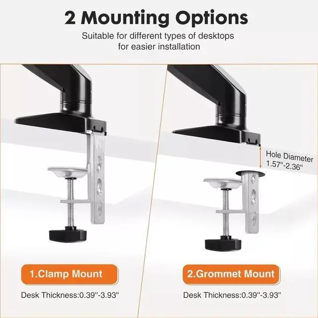 VERSATILE MOUNTING OPTIONS: Our single monitor mounts offer flexibility with two mounting options. Secure the mount to a tabletop using the "E" shaped clamps for tables ranging from 0.39 to 2.36 / 3.96 inches thick, or choose the grommet holes for a secure fit on tabletops of the same thickness range. To allow for rotation, carefully tighten without over-tightening; 50% tightening is recommended for optimal results. Select the mounting method that best suits your needs for a more flexible and convenient screen placement experience.