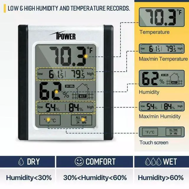 Low& high recordsindoor humidity meter displays low & high humidity and temperature records. You could also track conditions with the "all time" And "24 hrs" Records to ensure a healthy home.