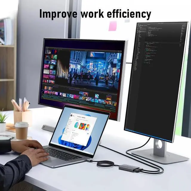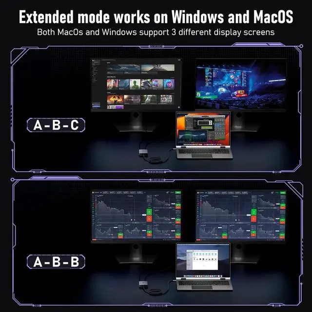 [Multi-Stream Transport] : The Multi-Stream Transport function of this dual monitor adapter mainly provides users of the Mac Os system with 3-screen differential display - 3 screens display different images (ABC mode). It is not limited to other product expansion functions and can only display at most with two screens.