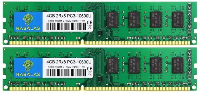 Rasalas 8GB Kit (2x4GB) PC3-10600 DDR3 1333 PC3 10600U Ram 2Rx8 PC3 10600U 1333 mhz DDR3 1.5V CL9 240-pin DDR3 Memory Module Upgrade for Desktop