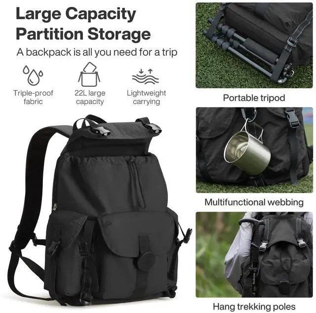 [(DURABLE)] The hiking backpack is made with high quality tear and water resistant, oil-proof, foul-proof material, provides additional strength and durability. Equipped with a multifunctional webbing design to enhance expandability and can be hung with tripods and others, perfectly meeting various outdoor needs such as photography, hiking, camping, etc.