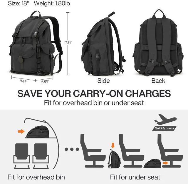 mixi Travel Backpack for Women Men, 18 Inch Carry On Laptop Backpack Flight Approved fits 16'' Laptop, Lightweight Waterproof Hiking Backpack Travel Outdoor Business Casual Daypack, Black