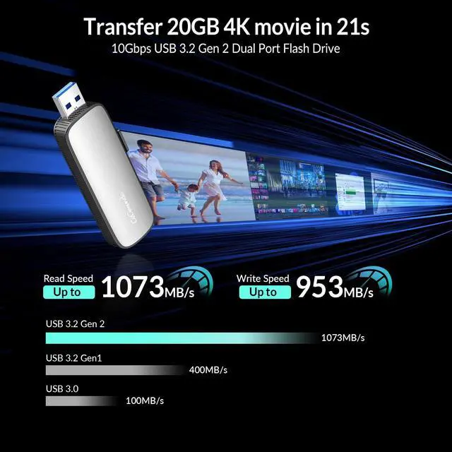 Speed: USB 3.2 Gen 2 thumb drive external hard drive up to 1073mb/s read speed and 953mb/s write speed, lightning-fast transfers for your files, 4K videos, and massive software in seconds, remains stable without lag.
